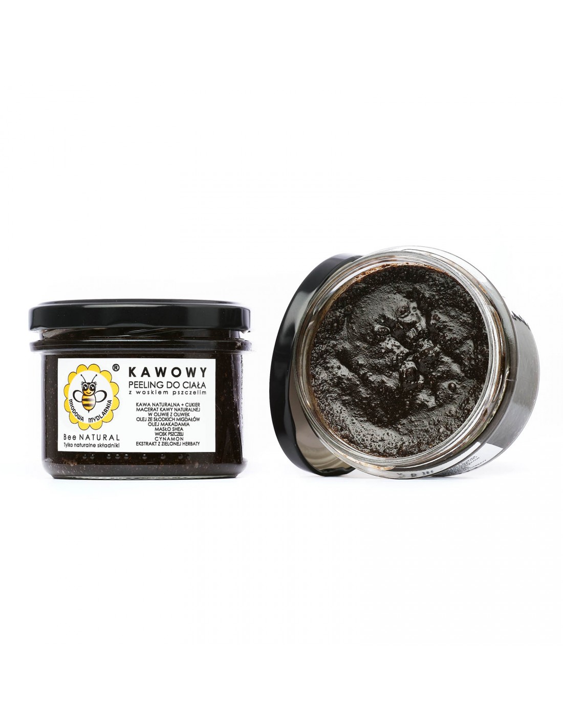 Intensywnie ujędrniający peeling kawowo-cukrowy z woskiem pszczelim na bazie mocnego maceratu kawy naturalnej w oliwie z oliwek. Wzbogacony kompozycją składników wspomagających walkę z objawami cellulitu: olej z orzechów makadamia – jeden z najlepszych „antycellulitowych” olejów naturalnych, zielona herbata – bogata w antyoksydanty i pełna dobroczynnej dla skóry kofeiny, cynamon – lekko rozgrzewający i pobudzający mikrokrążenie kawa naturalna –rewelacyjnie wpływająca na drenaż i usuwanie złogów tłuszczowych i toksyn nagromadzonych w przestrzeni miedzytkankowej.