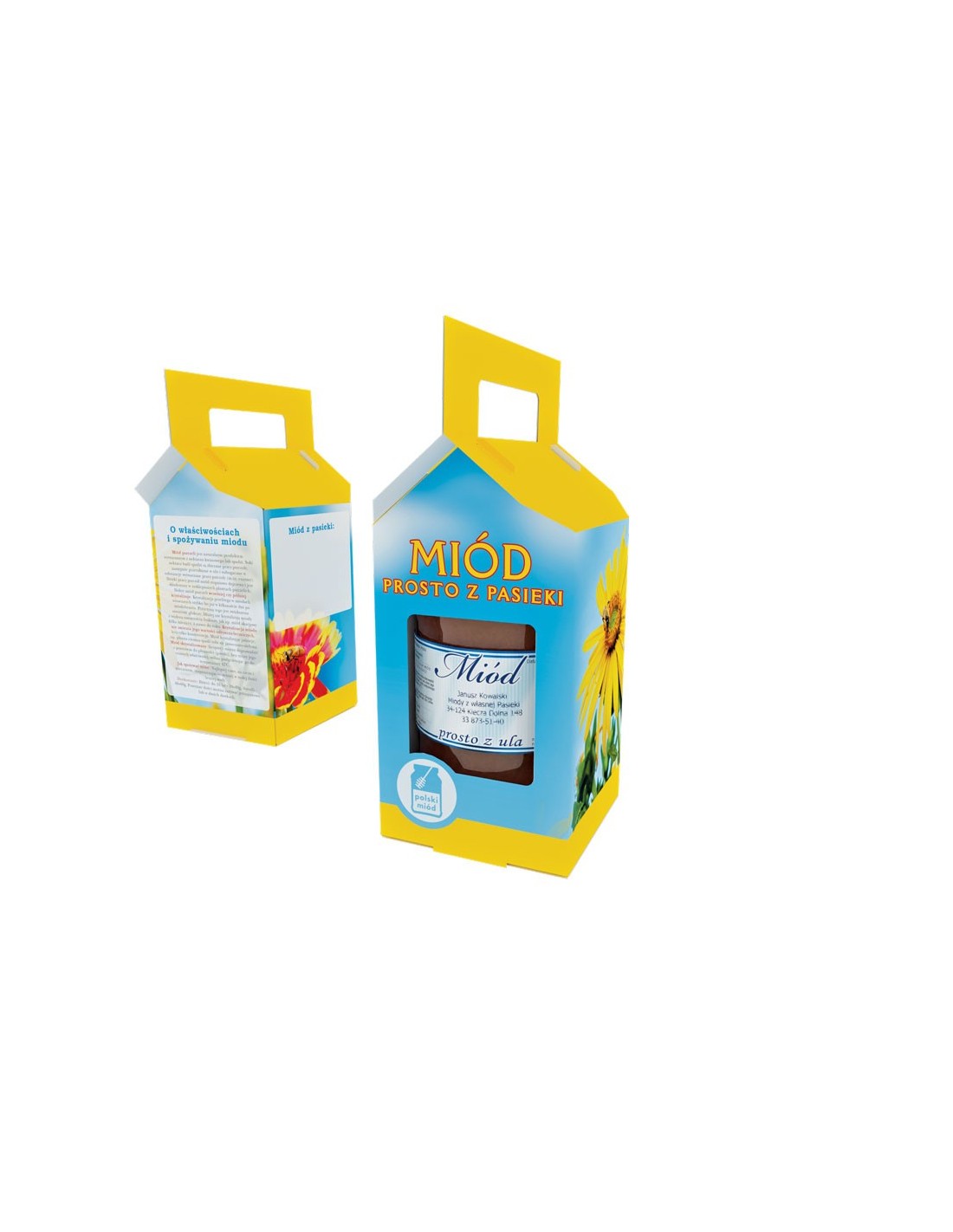 Pudełko ma solidne dno i mocny uchwyt. Zostało zaprojektowane tak, aby pudełko wytrzymało ciężar pełnego słoika miodu (900ml).